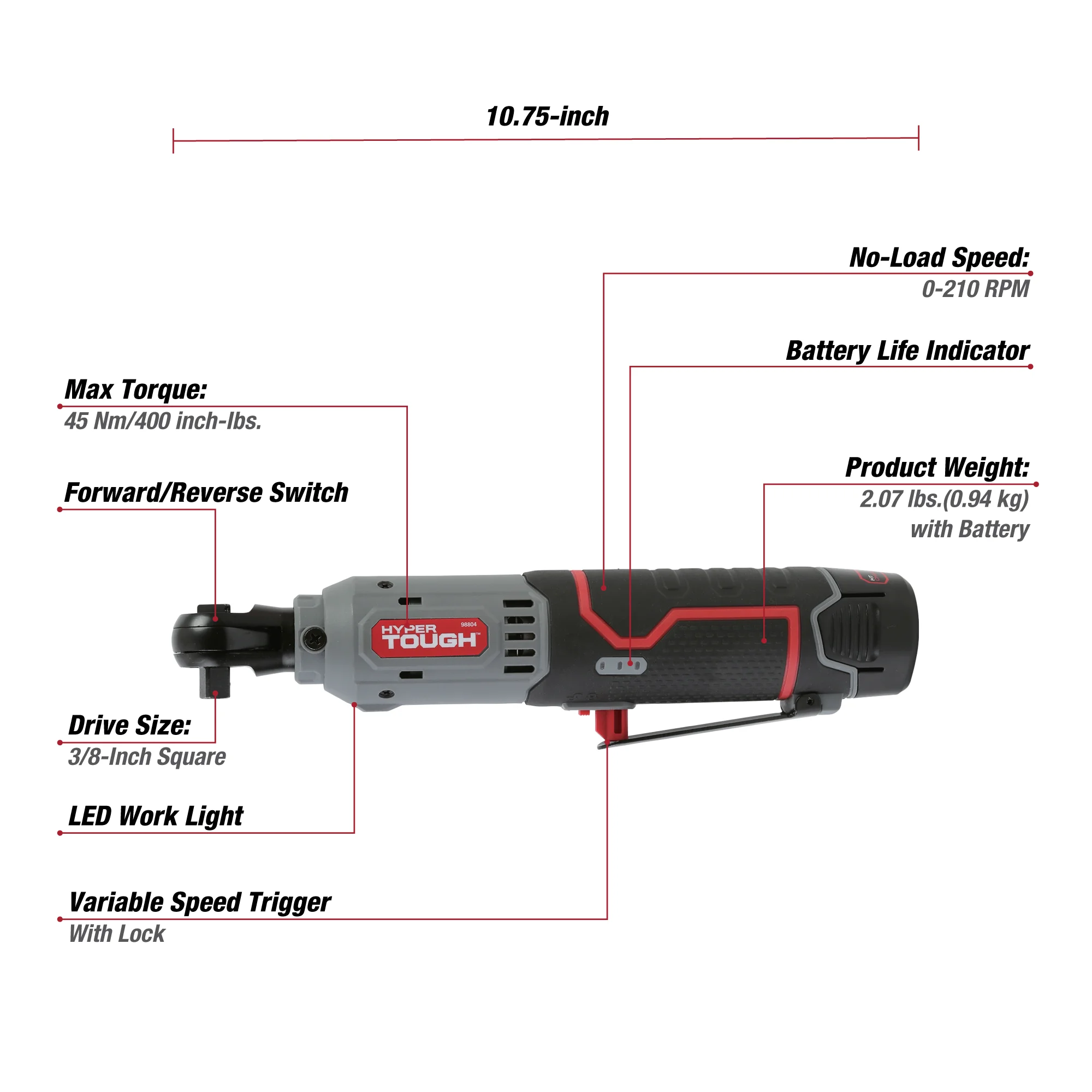 • Powerful Performance: The Hyper Tough 12V Max* Cordless Ratchet delivers up to 400-inch lbs. of torque and speeds up to 210 RPM, ideal for removing stubborn fasteners.